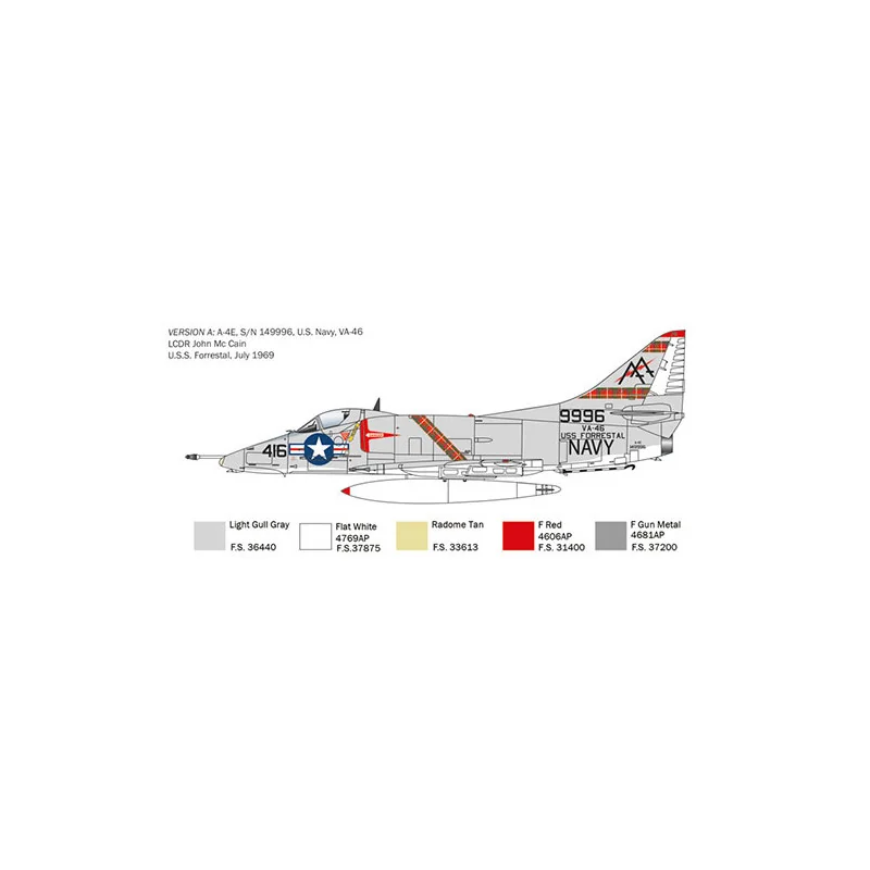 Le bombardier léger embarqué américain Douglas A-4 Skyhawk développé dans les années 1950 était un petit appareil compact idéalement conçu pour une utilisation sur porte-avions. Sa voilure delta de faible envergure dispensait de tout mécanisme de pliage des ailes. Les deux prises d’air placées haut sur le fuselage alimentaient le turboréacteur Pratt & Whitney J52 qui permettait d’atteindre la vitesse de 1.170km/h. L’armement interne était constitué de deux canons de 20mm et les pylônes sous les ailes et le fuselage pouvaient recevoir des missiles air-sol, air-air, des paniers à roquettes, des bombes lisses ou encore des réservoirs supplémentaires. Le A-4 a été intensivement utilisé durant la Guerre du Vietnam. Outre l’U.S. Navy et l’U.S. Marine Corps, il a été employé par l’Australie, la Nouvelle-Zélande, le Koweït et Israël, entre autres.