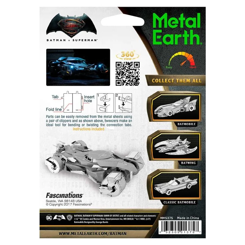 MetalEarth: BATMAN vs SUPERMAN / BATMOBILE, maquette 3D en métal avec 2 feuilles, sur carte 12x17cm, 14+