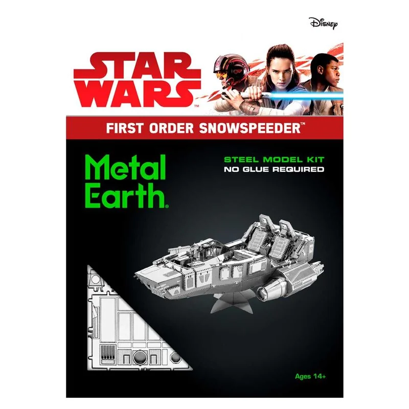 MetalEarth: STAR WARS (EP7) FIRST ORDER SNOWSPEEDER 8.26×5.72×3.43cm, maquette 3D en métal avec 2 feuilles, sur carte 12x17cm, 14+