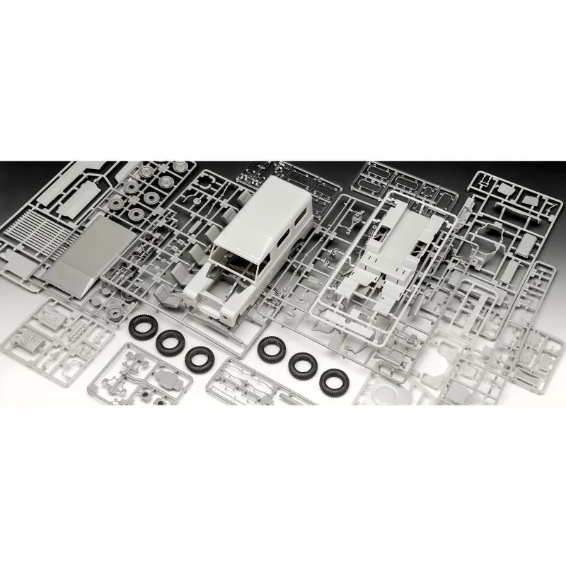 Kit de modèle réduit facile à construire de l’emblématique véhicule tout-terrain Land Rover Series III LWB en tant que « Commercial Vehicle ». Échelle 1/24. 174 pièces. 19,5 cm de longueur – 8,6 cm de largeur. Convient à partir de 10 ans. Kit de modélisme du Land Rover Commercial. Le véhicule utilitaire convenait pour le transport de marchandises peu maniables et aussi, grâce à sa surface de chargement protégée contre la corrosion, de substances corrosives. – Moteur quatre cylindres en plusieurs parties – Version avec volant à droite ou à gauche – Décalcomanies avec différents marquages (D, A, NL, B, F, GB, I, CH, IRL)