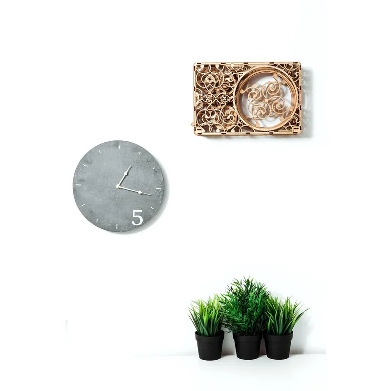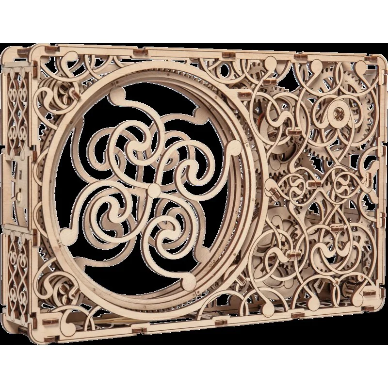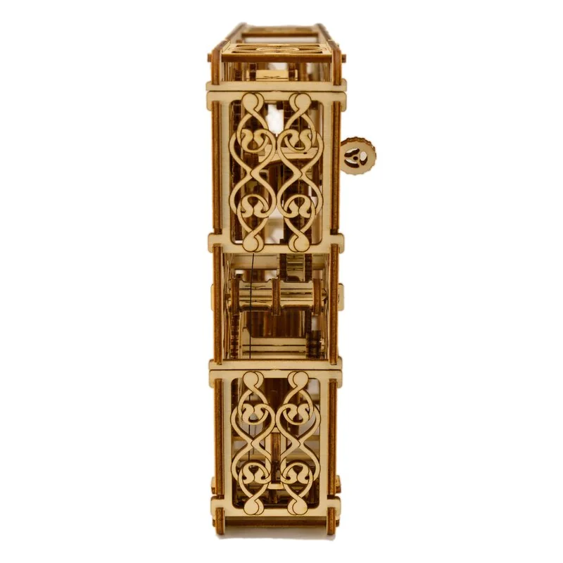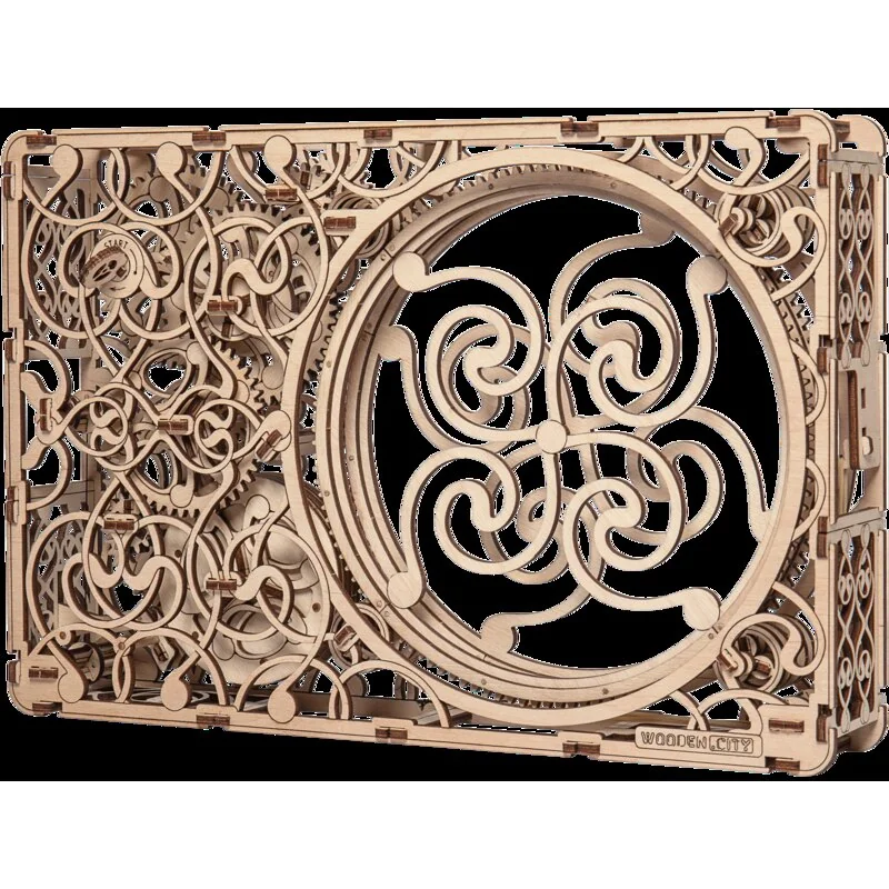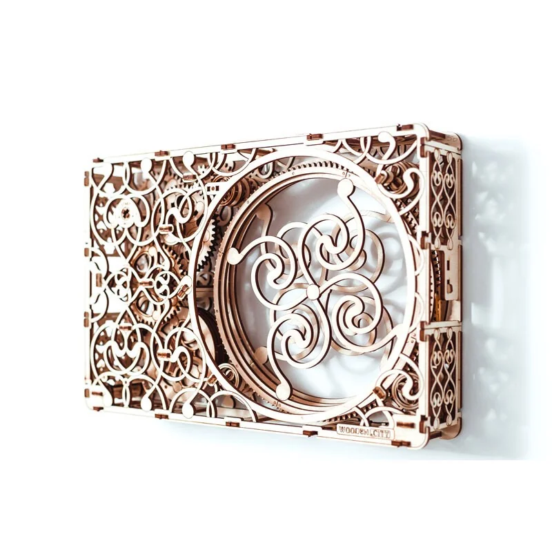 L’horloge magique Wooden City possède deux cadrans, un pour les heures et un pour les minutes. Elle est ornée de jolies gravures fantaisie et possède des engrenages en rotation qui soutiennent le rythme de la pendule. Cette horloge permet d’observer l’ensemble du mécanisme d’horlogerie le plus basique. Le mouvement de l’horloge dure une demi-heure.